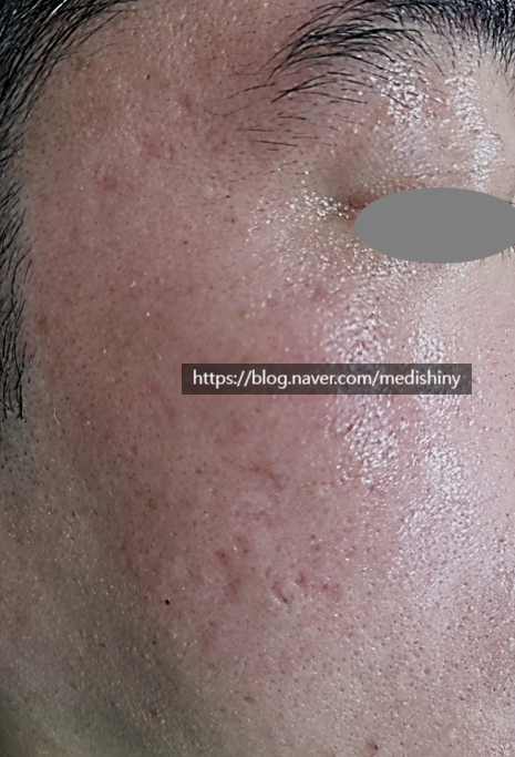 The nose had raised hypertrophic papular scars, the temples had deeply depressed atrophic scars, and both cheeks had sharp, deep nail marks—as if cut with a knife. It was a full set of three types of scars.