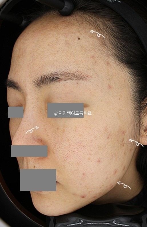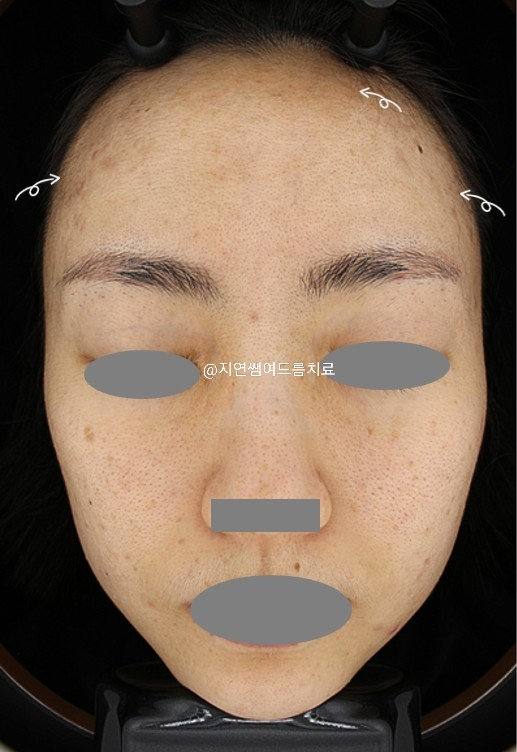 trouble marks and pigmentation remained from the forehead line to the temples and chin.