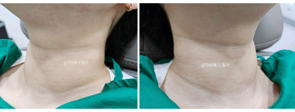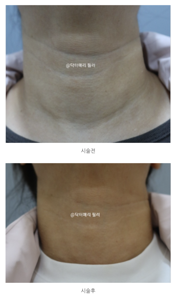 Similarly, the deep neck wrinkles before the procedure have become shallower and less noticeable. The after photo was taken slightly darker and more clearly to highlight the results.